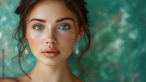 Beautiful girl with earrings and perfect make-up isolated on a green backdrop.