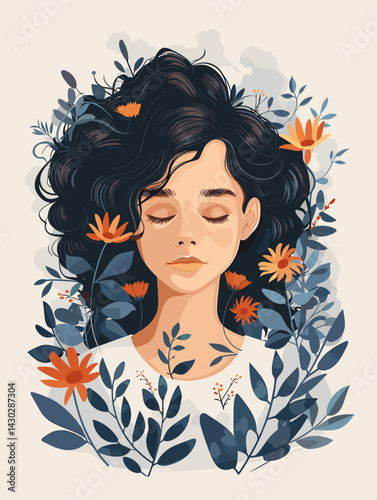 Beautiful girl with flowers and leaves. Vector illustration in a flat style.