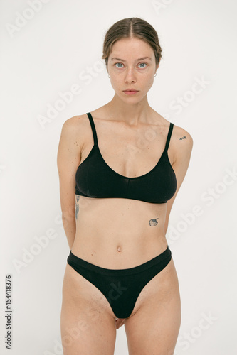 Beautiful girl without makeup with natural skin in lingerie on a white background