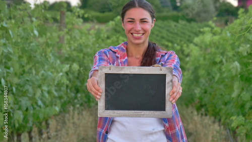 Beautiful girl (woman) farmer smiling watching the grape fields, holding a black board, in a shirt, greens background Concept ecology wine bio product, inspection, water, natural products, agriculture
