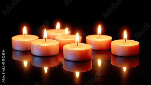 Beautiful Glowing Candles in a Dark Setting with Reflections Creating a Serene and Peaceful Atmosphere for Relaxation and Meditation