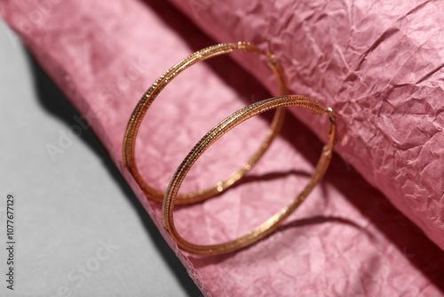 Beautiful golden earrings on crumpled paper against grey background, closeup