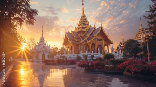 Beautiful golden temple in Thai style during the morning sunrise, with the light enhancing the intricate details and serene setting.