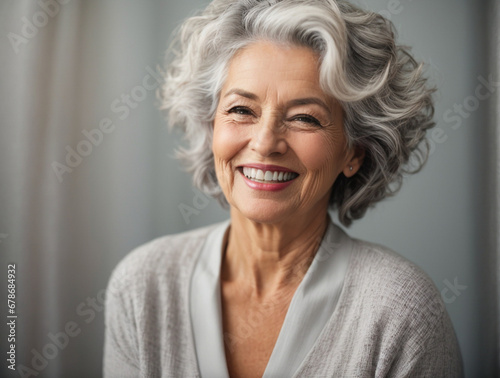 Beautiful gorgeous 50s mid age beautiful elderly senior model woman with grey hair laughing and smiling on a gray background