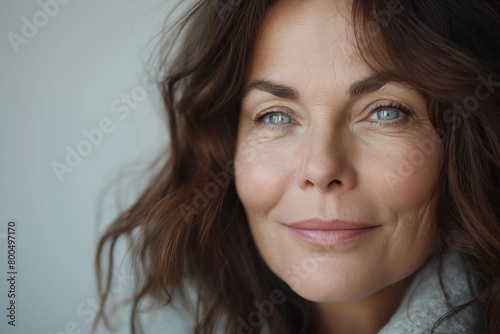 Beautiful gorgeous 50s mid aged mature woman looking at camera isolated on white. Mature old lady close up portrait. Healthy face skin care beauty, middle age skincare cosmetics.