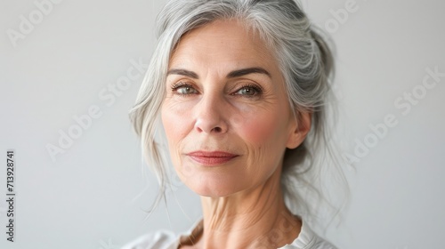 Beautiful gorgeous 50s mid aged mature woman looking at camera isolated on white. Mature old lady close up portrait. Healthy face skin care beauty, middle age skincare cosmetics, cosmetology concept