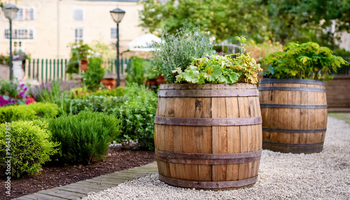 Beautiful green garden with wooden barrel planters and variety of plants. Landscape design.