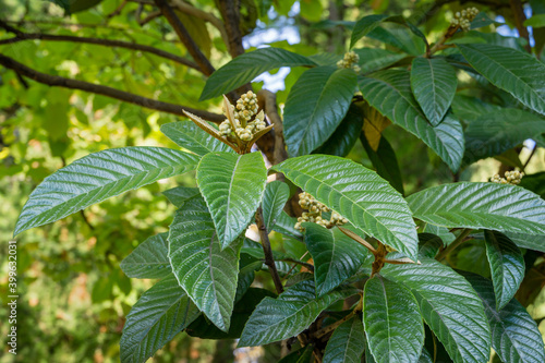 Beautiful green leaves and buds of Japanese loquat tree (Eriobotrya Japonica) in autumn Sochi city park
