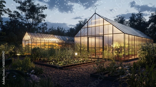 Beautiful greenhouses illuminated at dusk, showcasing lush plants and vibrant colors in a serene outdoor garden setting