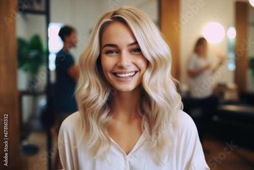 Beautiful hairstyle of young Caucasian happy woman after dying hair and making highlights in hair salon.