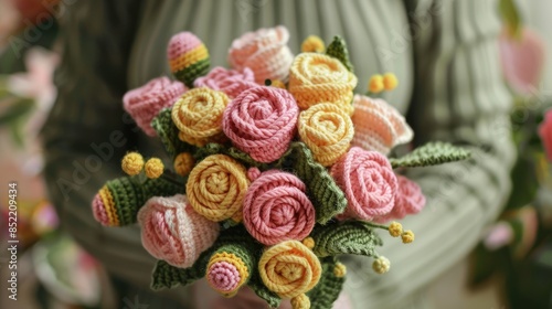Beautiful handcrafted crochet flowers bouquet featuring pink and yellow rose buds