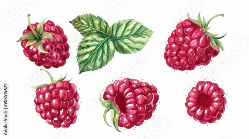 Beautiful handdrawn raspberry art with vibrant green leaves, perfect for food lovers and art enthusiasts alike.