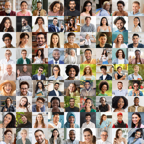 Beautiful happy people posing on various backgrounds, collage