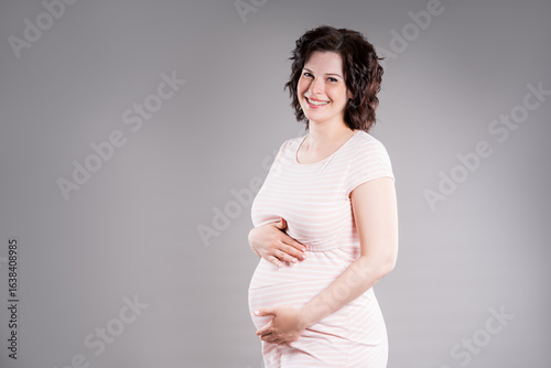 Beautiful happy pregnant woman in tight dress on gray background, maternity clothes, pregnancy photoshoot