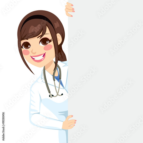 Beautiful happy professional female doctor peeking out of a blank billboard