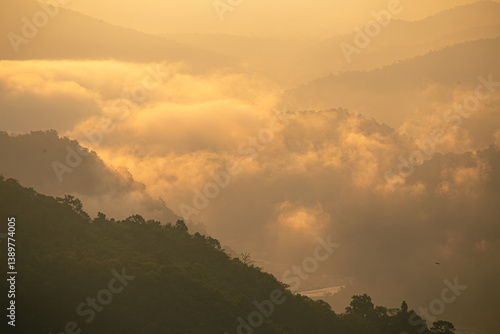 Beautiful high angle view of the sea of mist in the morning amidst the green forest at the hill tribe village of Huai Kup Kab, Mae Taeng, Chiang Mai, Thailand.
