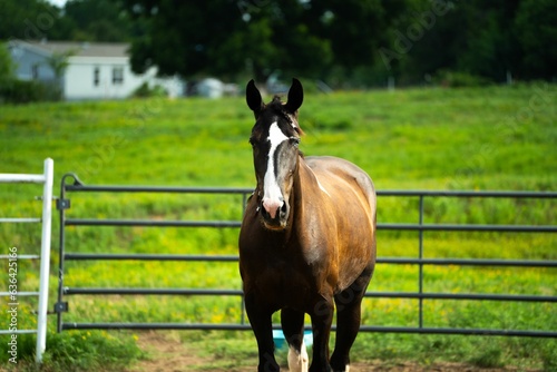 Beautiful horse gallops down a path surrounded by lush green foliage