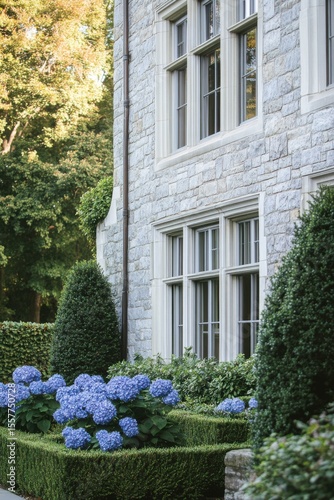 Beautiful hydrangea flowers bloom by a classic stone house surrounded by lush greenery and meticulously trimmed hedges during a serene afternoon in a tranquil garden setting