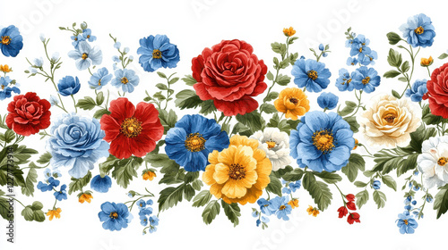 Beautiful illustration of colorful flowers featuring red, blue, and yellow blooms. Ideal for decorative purposes, textile designs, or artistic projects.