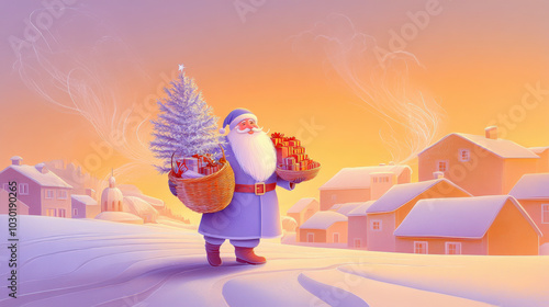 Beautiful illustration of Santa Claus in a blue outfit carrying a Christmas tree and gifts, walking through snowy hills overlooking a village at sunset.