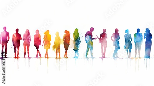 Beautiful image of a group of people silhouettes standing, drawn in the style of colorful watercolors. Generative AI