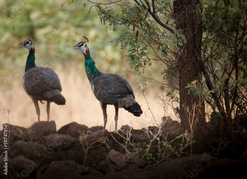 Beautiful Indian peafowl and Peahen in jungle roaming freely in field. Beautiful back ground of Indian peacock or peafowl for seasonal greetings or wall mounting. Beauty of colours.