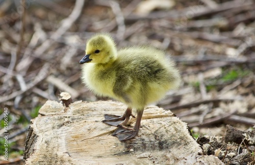 Beautiful isolated image of a cute funny chick of Canada geese on a stump
