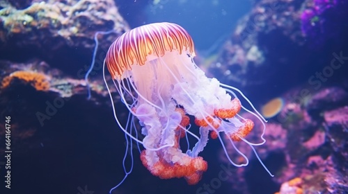 Beautiful jellyfish swimming in the aquarium. Underwater world.