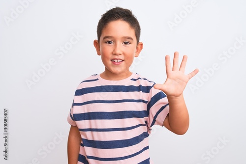 Beautiful kid boy wearing casual striped t-shirt standing over isolated white background showing and pointing up with fingers number five while smiling confident and happy.