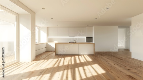 Beautiful kitchen in new luxury home with large waterfall island, stainless steel appliances, white cabinets, and hardwood floors