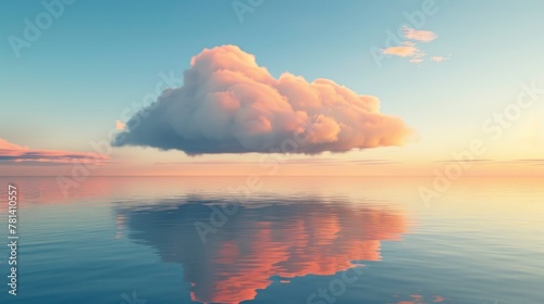 Beautiful lake with a white cloud in a minimalist orange sunset in high resolution and high quality. landscape concept