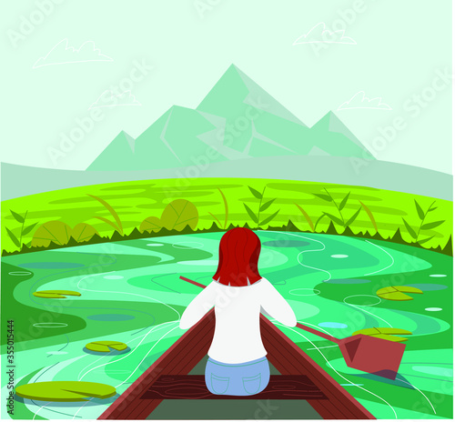 Beautiful landscape. Boat, pond and mountain view. The girl in the boat. The concept of outdoor recreation. Flat vector illustration.