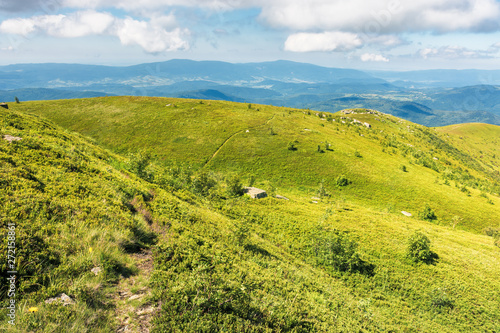 beautiful landscape of runa mountain, ukraine. green landscape on a bright forenoon. ridge in the distance. footpath through meadows of European blueberry also called Vaccinium myrtillus on hills.