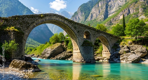 Beautiful landscape with old stone bridge and mountains