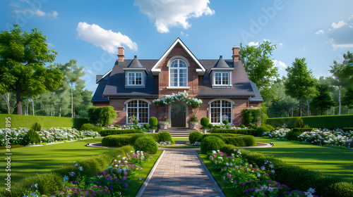 Beautiful landscaped front yard with trimmed lawn and flower bed in a Georgian style family house exterior with roof tiles and dormer windows