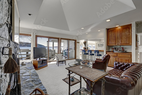 Beautiful living room with wet bar and doors to deck