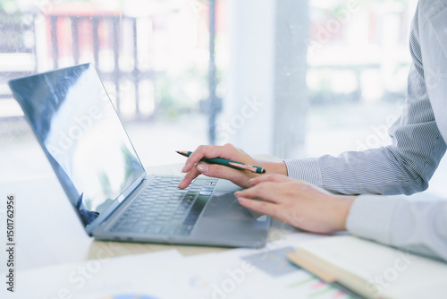 Beautiful looking Asian businesswoman working with digital laptop in office. Businesswoman and marketing concept.