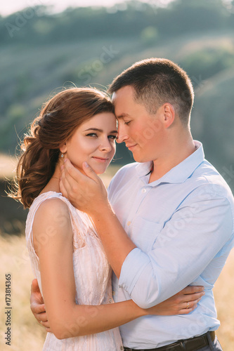 Beautiful love story in the fog with the rays of the sun.. Couple in love in the evening haze. Creative colors