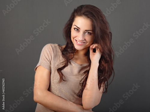 Beautiful makeup toothy enjoying smiling woman with long brown healthy curly hair style in fashion shirt clothing. Closeup studio portrait on grey