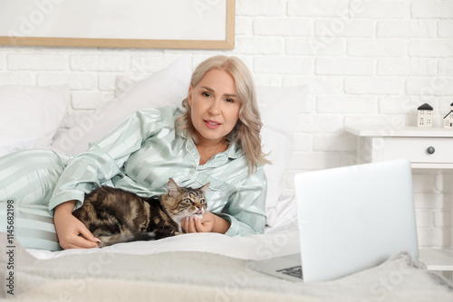 Beautiful mature happy woman in pajamas with cute cat and laptop lying on bed at home