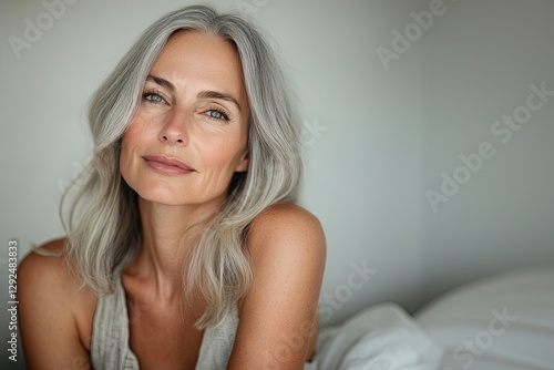 beautiful mature well-groomed woman with natural makeup, with beautiful gray hair.