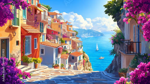 Beautiful Mediterranean coastal village background with vibrant houses, ocean views, and lush summer flowers. Dreamy European getaway, perfect for use in travel brochures, vacation promotions, and sum