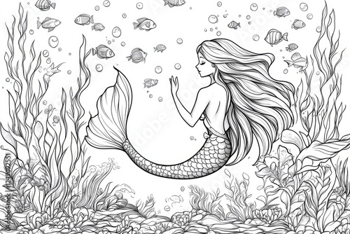 Beautiful mermaid swimming underwater surrounded by fish and seaweed