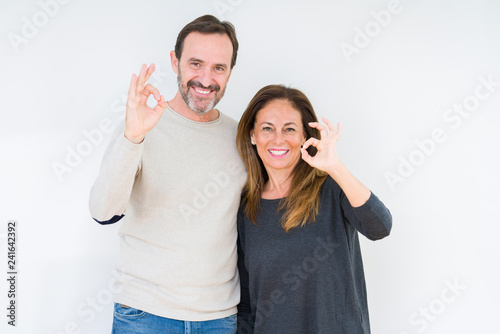 Beautiful middle age couple in love over isolated background smiling positive doing ok sign with hand and fingers. Successful expression.