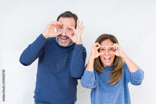 Beautiful middle age couple in love over isolated background Trying to open eyes with fingers, sleepy and tired for morning fatigue