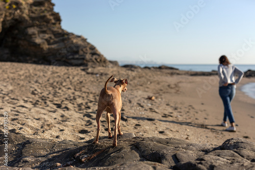 Beautiful middle-aged brunette woman playing with Italian greyhound dog on the beach