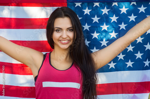 Beautiful model poses with the flag of the USA in the summer park