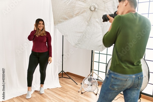 Beautiful model posing for professional photographer at studio.