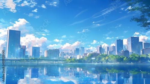 Beautiful modern cityscape by a lake with blue skies and clouds in anime style
