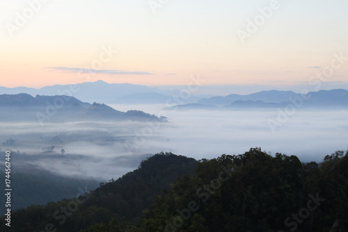 Beautiful morning mountains range and mist with the sunrise. Creating a peaceful and atmospheric. Before sunrise.